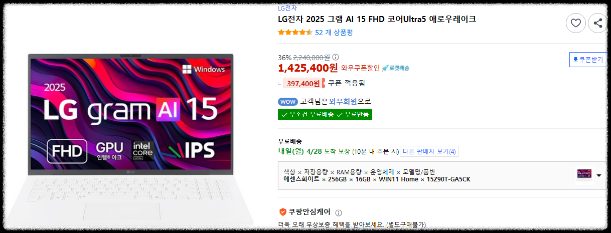 LG그램 15Z90T-GA5CK는 깔끔하고 군더더기 없는 디자인이 인상적입니다. 메탈 소재의 고급스러움과 부드러운 곡선 라인이 잘 어우러져 있습니다. 무엇보다 15.6인치 대화면을 탑재했음에도 불구하고 무게가 약 1.1kg에 불과해 놀라웠습니다. 백팩이나 토트백에 넣어도 부담이 없었고, 장시간 들고 다녀도 피로감을 느끼지 않았습니다.